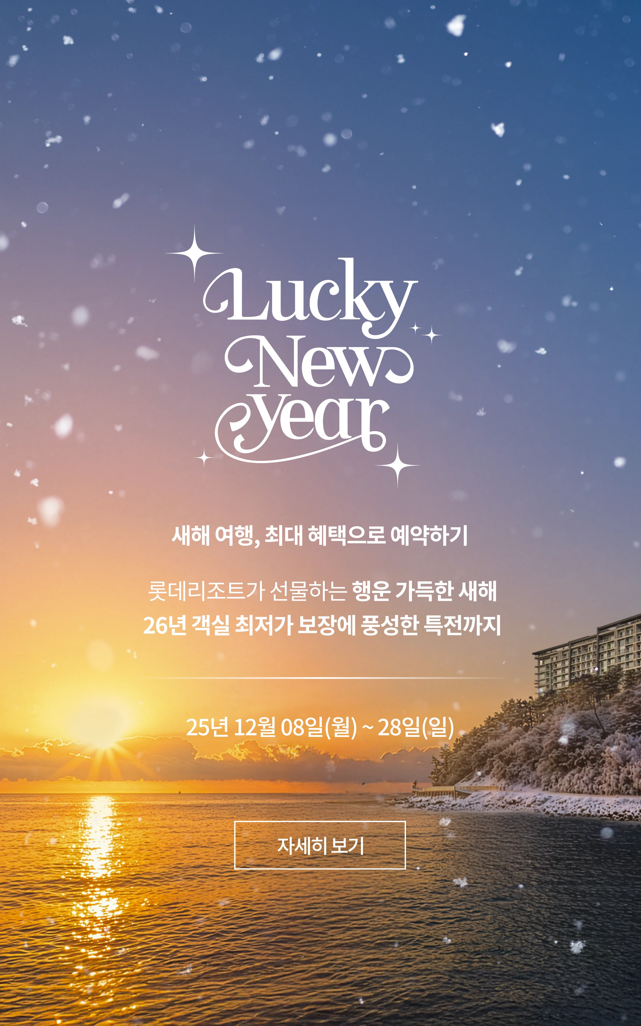 반짝이며 부서지는 파도 너머 끝없이 이어지는 투명한 하늘 하늘과 바다 사이, 설악의 바람이 머무는 장소 롯데리조트속초의 자연을 만끽하는 새로운 기준입니다.
