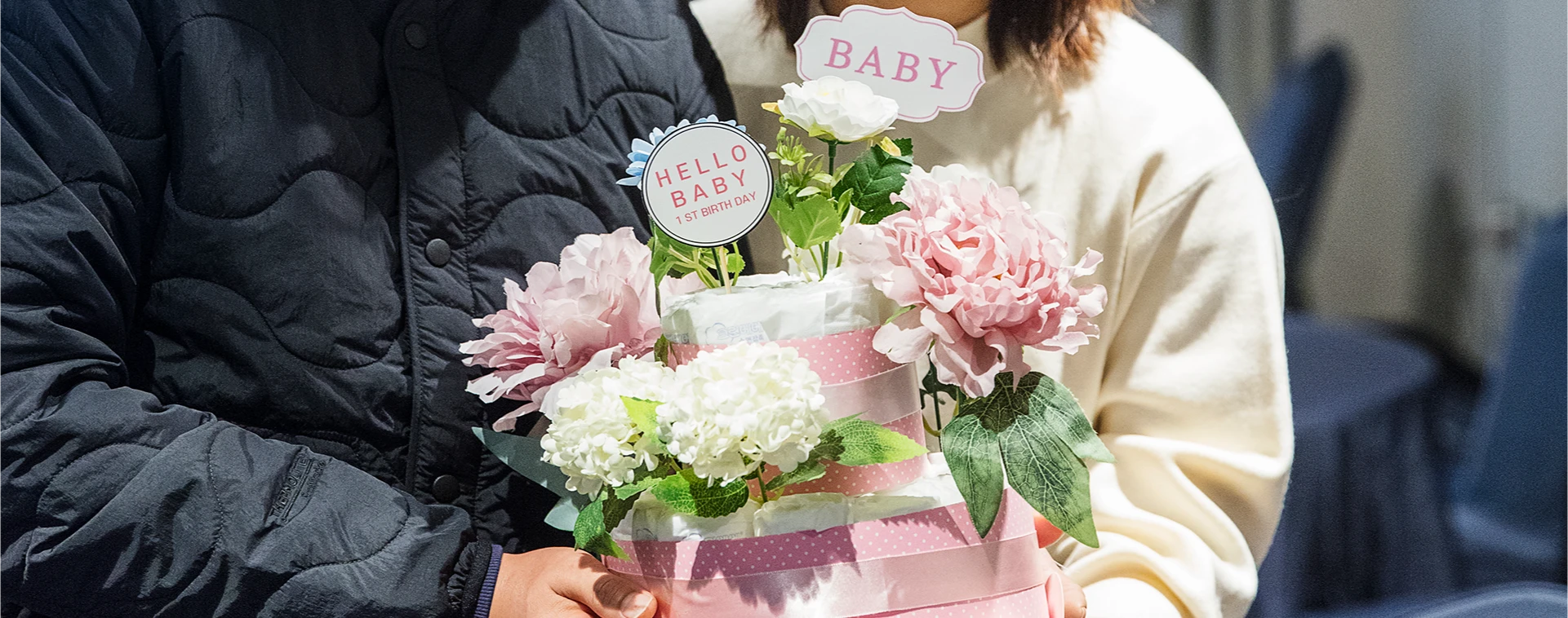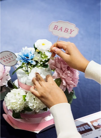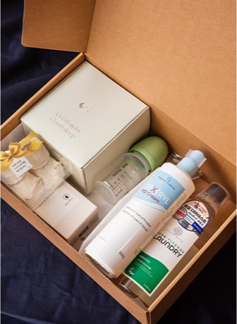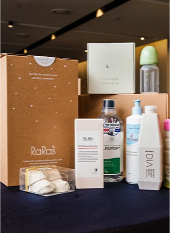 키링, 롯데웰푸드의 제로캔디 레몬, 위들스토어의 보타니컬 테라피 트래블 키트, 말랑하니의 온습도계와 수유등 세트, 텐박스의 베어밸리 튼살크림과 비건 수딩젤 등 다양한 출산 준비 아이템을