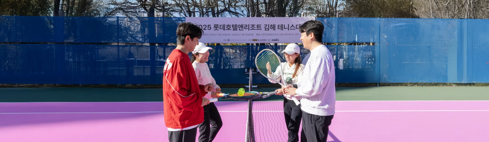 지난 해 11월 29일과 30일 진행된 ‘2025 롯데호텔앤리조트 김해 테니스 대회’는 그러한 기대가 현실로 펼쳐진 자리였다. 호텔 내 스포츠 시설과 웰니스 센터의 운영을 맡고 있는 JNGK의 주관 아래, 이틀간 이어진 대회는 혼합 복식, 남자 복식, 여자 복식으로 나뉘어 치러졌다. 혼합 복식은 구력 2년 이하, 남자 복식은 지역・전국 신인부, 여자 복식은 개나리부를 대상(입상자 제외)으로 참가 신청을 받았는데, 최종 32팀(64명)이 참가하며 첫 대회부터 큰 호응을 이끌어냈다. 푸짐한 경품과 시상 내역도 대회의 열기를 한층 뜨겁게 달구었다. 모든 참가자에게 이번 대회의 협찬사이기도 한 디아도라(diadora)의 리커버리 세트(물통, 무릎보호대, 마사지볼)가 제공되었고, 우승자에게는 트로피와 상장, 50만 원 상당의 롯데호텔앤리조트 김해 무료 숙박권, 준우승자에게는 상장과 롯데호텔앤리조트 김해의 웰니스 센터에서 사용할 수 있는 웰니스 쿠폰북이 부상으로 마련됐다.