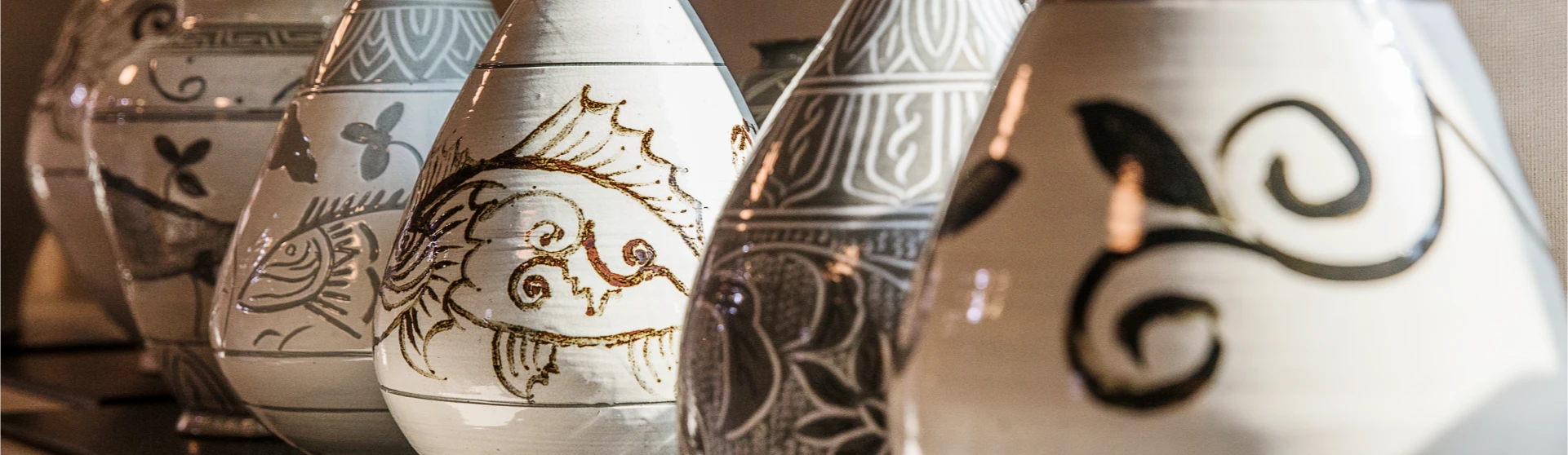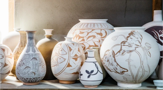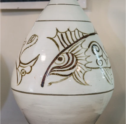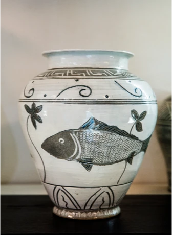 그 위에 철화 안료나 칼로 정해진 도안 없이 자기 마음대로 그림을 그려요. 당시 다산과 풍요를 상징하는 물고기, 연꽃이 문양 소재로 특히나 많이 등장했지.