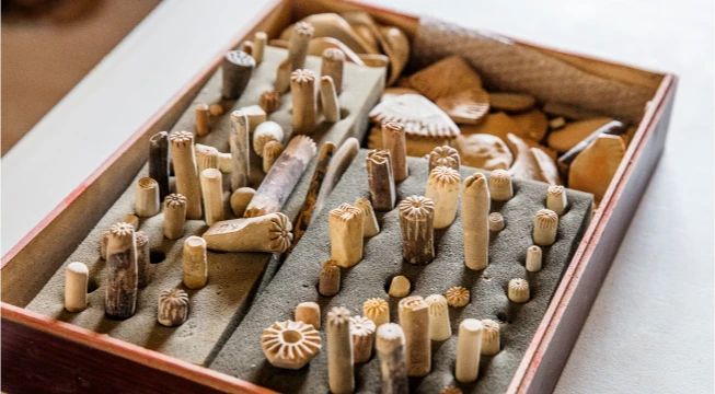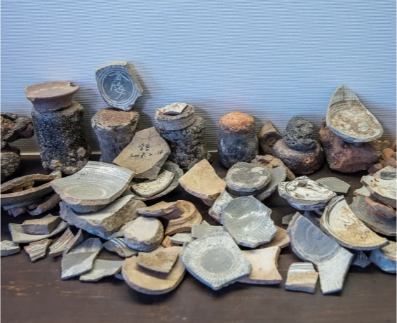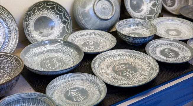 김해 지역의 찻사발은 회색 자기에 섬세하게 찍은 도장 위에 백토를 발라 아름다운 문양을 드러내는 것이 가장 큰 특징인데요, 2001년부터 아홉 가지의 찻사발을 찾아 복원했고 아직도 좀 남았어요.
